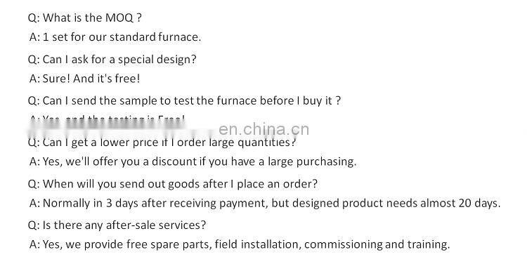 Chamber material | The light alumina ceramic fiber is used internationally, which has excellent heat preservation effect, light weight, high temperature resistance, quick cooling and heat resistance, no crack, no crystallization, no slag falling, no worry about pollution of the products. The energy saving effect is 60% to 80% of the old electric furnace. | ||||||