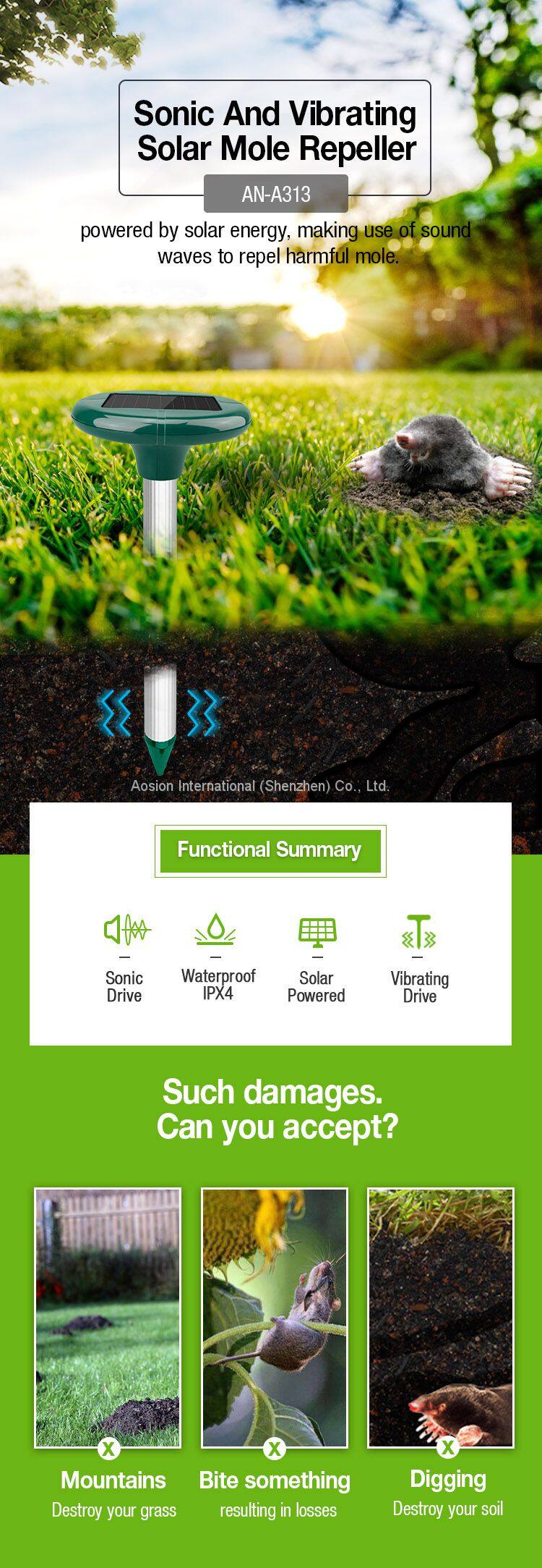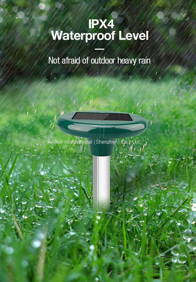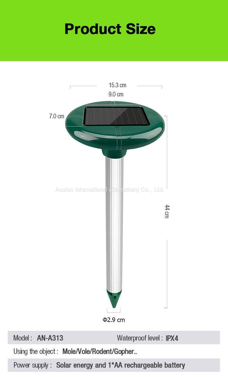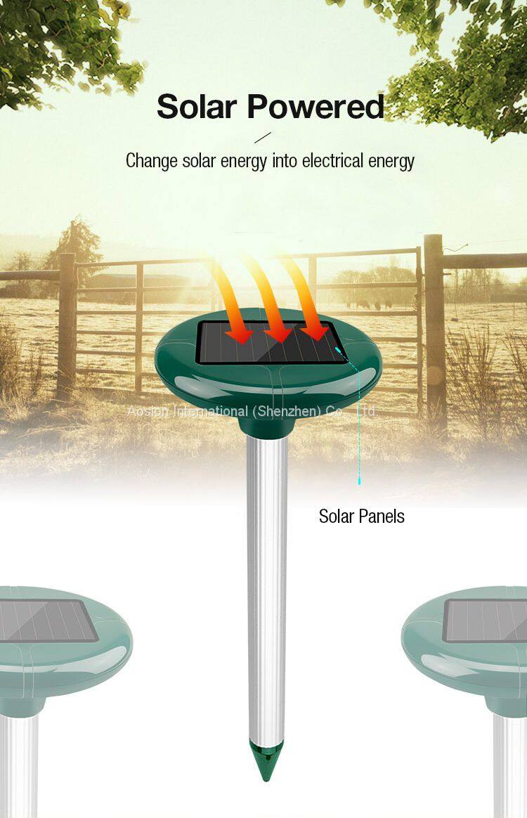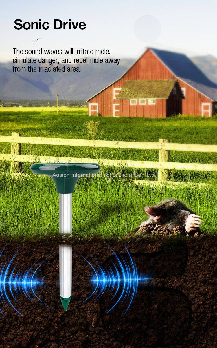 1.By emitting sound waves, the gopher and mole repellent drives away Molevery effectively. The sound waves will irritate them, simulate danger, and repel them away from the irradiated area. Transmitting sound waves every 40 seconds or so, the Solar Mole repellent is effective within an area of 650 square meters.