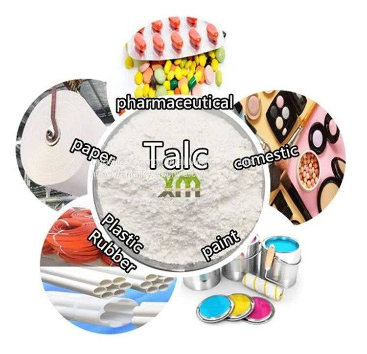 Talc powder has properties of lubricity,viscous resistance,flowing boosting,fire resistance,acid resistance,insulativity,high melting point,inactive chemical reaction,good covering power,soft,good shining,good adsorptivity,it's mainly used in paint,coating,rubber,plastics,cable,ceramics,cosmetic,paper making and EVA shoes materials.