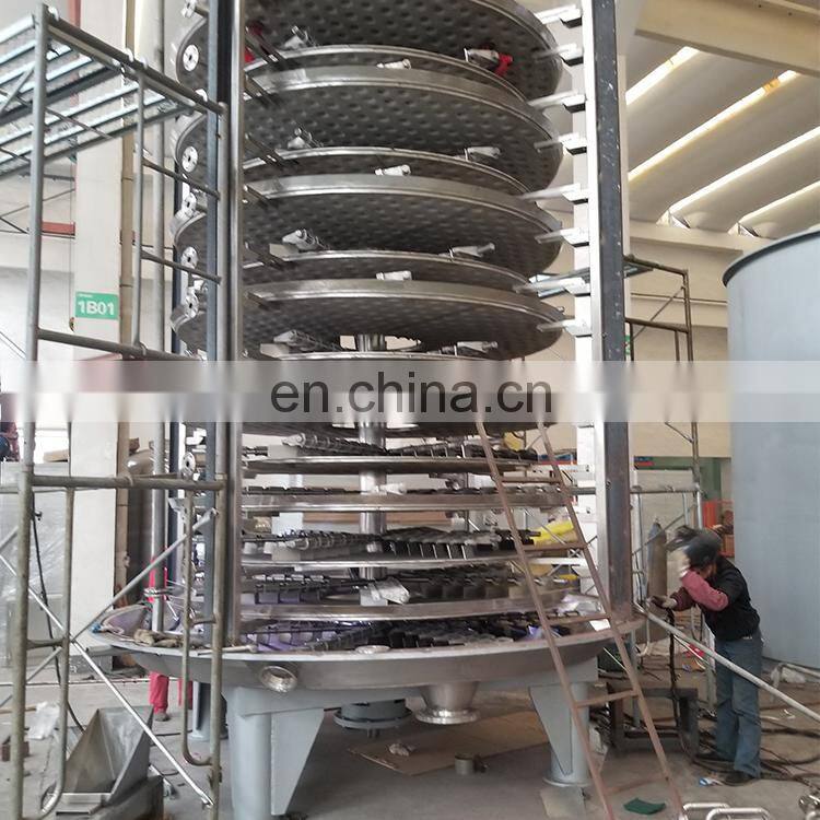 Wet materials are fed continuously to the top drying layer in the dryer. They will be turned and stirred continuously by harrows when the harrow's arm rotates, the material flows through the surface of the drying plate along the exponential helical line. On the small drying plate the material will be moved to its exterior edge and drop down to the exterior edge of the large drying plate underneath, and will then be moved inward and drop down from its central hole to the small drying plate on the next layer.Both small and large drying plates are arranged alternately so as materials can go through the whole dryer continuously. The heating media, which could be saturated steam, hot water or thermal oil will be led into hollow drying plates from one end to other end of the dryer. The dried product will drop from the last layer of the drying plate to the bottom layer of the smell body,