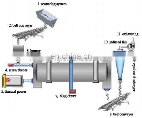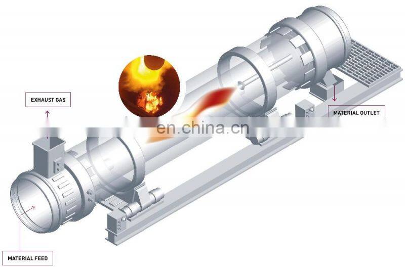 Rotary dryer adopts direct flow type of heating with heat soure from firing unit. The material to be dried is pushed back immindiately by spiral board when enters the shell from feeding tank and feeding chute. Because the drier is installed in slope, material flows to the back end under gravity and rotation force, meanwhile, it is lifted by board repeatedly and thrown down accordingly, which make the material form even curtain, and exchange heat sufficiently with inner the heat flow. In the end, water in the material is dried by repeatedly scattering.
