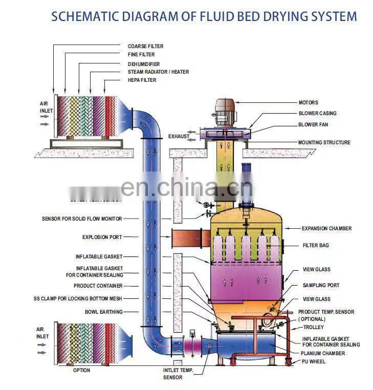 Separated granule solid raw material is fed into fluidized-bed drier through feeder, Fresh air through filtering and heating is sent to the bottom of fluidized-bed by fan and contacts with solid raw material on distributing plate. In this way the fluidized state is formed and the heat exchange between air nd solid is carried out. The dried raw material is discharged from outlet and wasted gas is exhausted from the top of fluidized-bed where catches sold powder through cyclone separator, cloth bag duster.