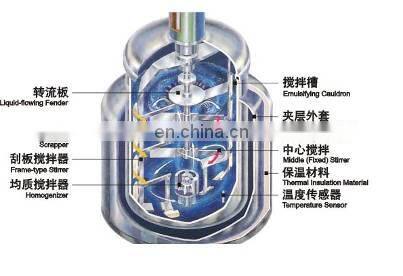 4.Mightiness balance isotactic curve rotor is matched with stator with corresponding structure to realize liquid high -capability cut,rubbing,centrifugal to make sure exquisite and slick cream; boiler body and pipe surface mirror polishing 300EMSH (sanitation grade) accords with Daily Chemical and GMP regulation.