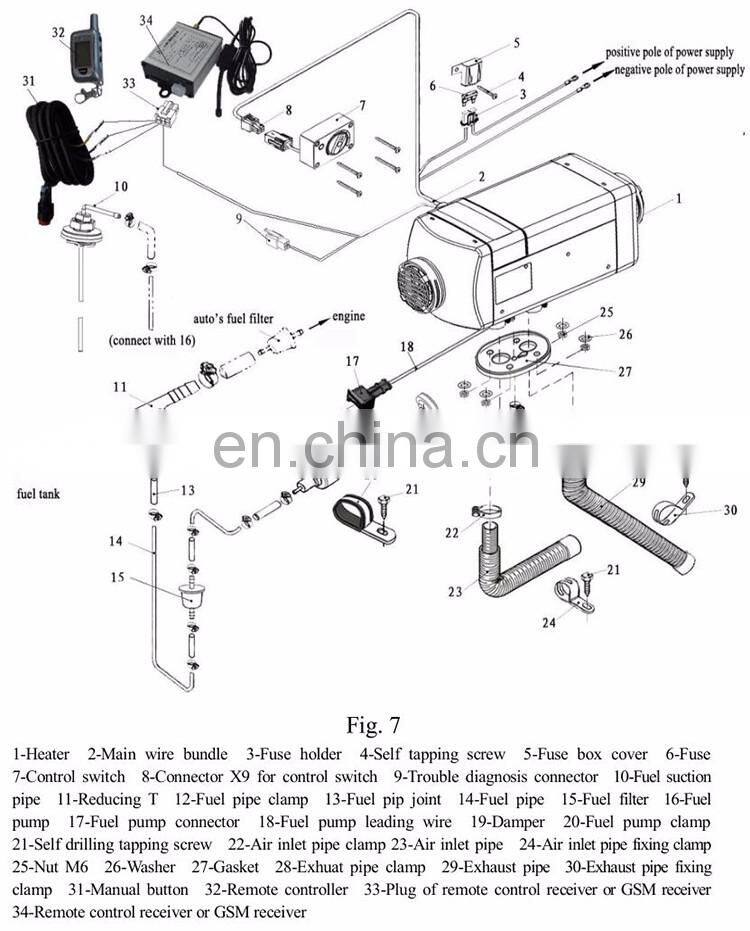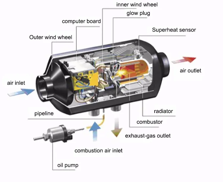 The heating system uses diesel or gas as fuel. After heating the cooling liquid of the engine, the forced-circulation water pump circulate in the car's water way, preheats the engine and reduces the attrition, achieves the purpose of eliminating the frost and warming the compartment.