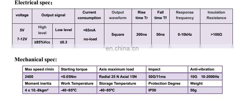 Matrix reading, with high impact resistance, strength capability to error correction high reliability, and installation sizes small, wide range of resolution, do not require the signal conditioning. Assembly requirements are less, and has compensation ability of motor shaft radial and axial shifting, widely used in the DC motor, with a multi-aperture for selection.