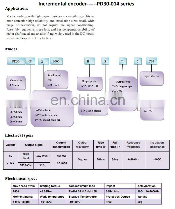 Matrix reading, with high impact resistance, strength capability to error correction high reliability, and installation sizes small, wide range of resolution, do not require the signal conditioning. Assembly requirements are less, and has compensation ability of motor shaft radial and axial shifting, widely used in the DC motor, with a multi-aperture for selection.