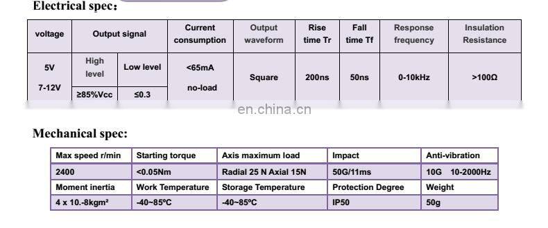 Matrix reading, with high impact resistance, strength capability to error correction high reliability, and installation sizes small, wide range of resolution, do not require the signal conditioning. Assembly requirements are less, and has compensation ability of motor shaft radial and axial shifting, widely used in the DC motor, with a multi-aperture for selection.