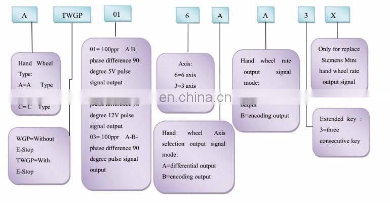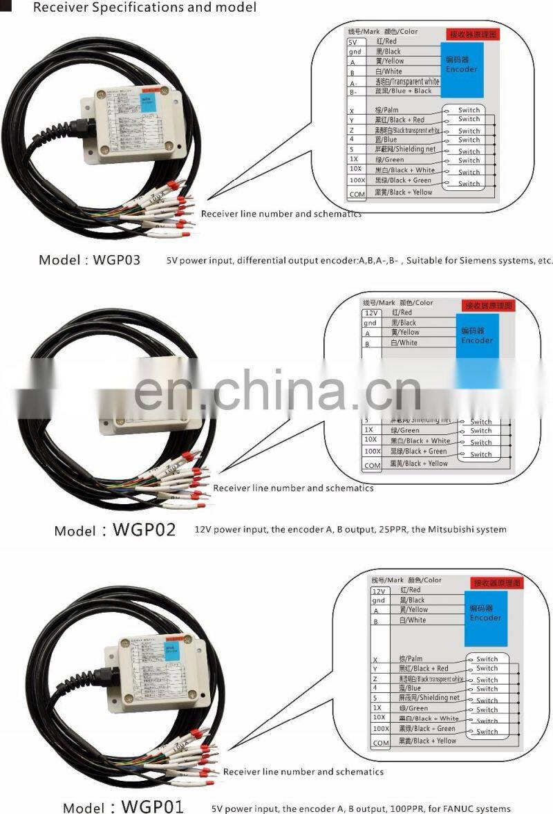 Wireless electronic handwheel (manual pulse generator), the receiver through 16 core line spring is connected with a machine tool, electronic handwheel, manual pulse generator) through wireless transmission technology and the receiver are connected to the news, the operator can hand handwheel, get rid of the line spring join irreducible, to move around freely, easy to operate, freedom, stable and reliable, reduce the failure rate (because the traditional cable wheel, you need to connect with the line, a long time, spring line inside the cable easily broken, causing failure to operate). For large-scale Longmen milling, large numerical control lathe, large-scale machine tool and other applications, but also brings great convenience, improve work efficiency.