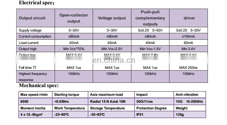 Brief: Widely used in automatic control, automatic measurement, as the angle and speed sensors. ASIC devices internal, good reliability, long life, anti-jamming performance. Stainless steel shaft has a higher stability and protection.Metal shell is more solid and anti-impact. Bearing load heavy, anti-oil and water.