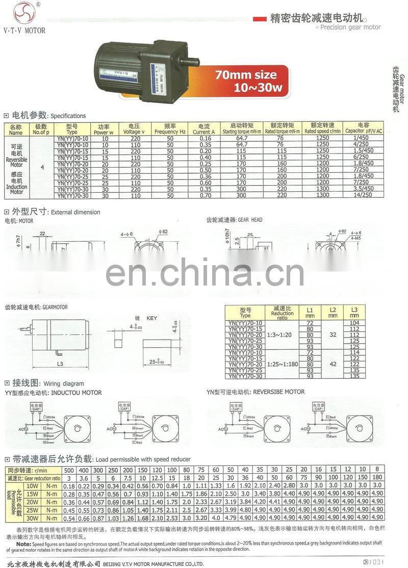 YN70 Series VTV 220Vac 70*70mm outer gear motor