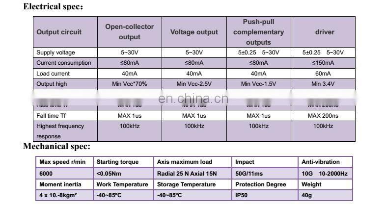 Widely used in automatic control, automatic measurement, as the angle and speed sensors. ASIC devices internal, good reliability, long life, anti-jamming performance. Stainless steel shaft has a higher stability and protection.Metal shell is more solid and anti-impact. Bearing load heavy, anti-oil and water.