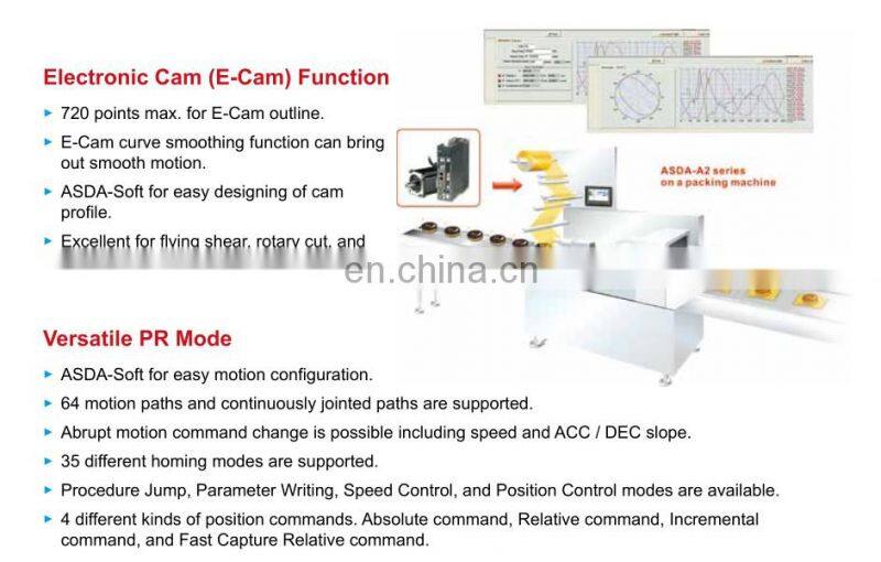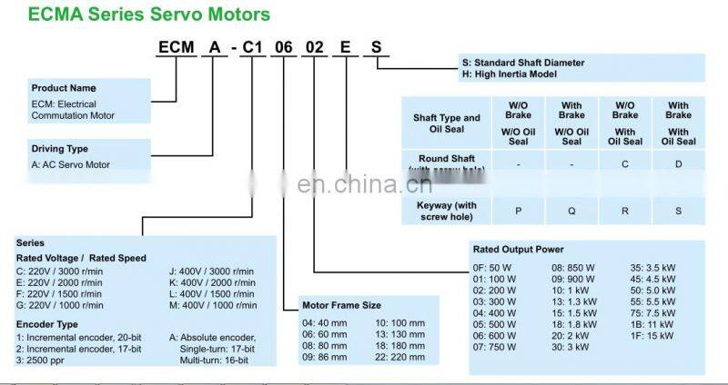 ► ECMA series servo motors feature incremental encoders with 20-bit level resolution which can improve low speed stability, smooth motor operation and enhance the accuracy of positioning.