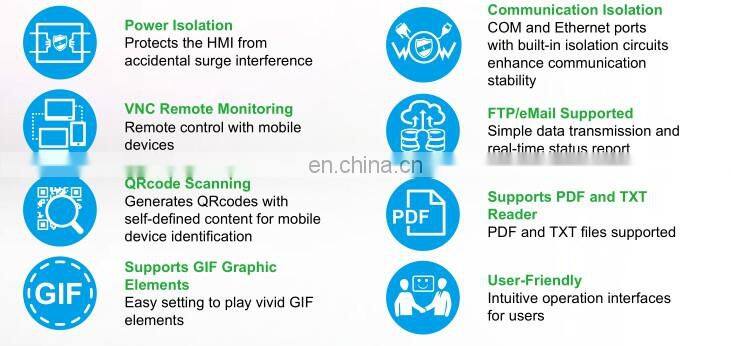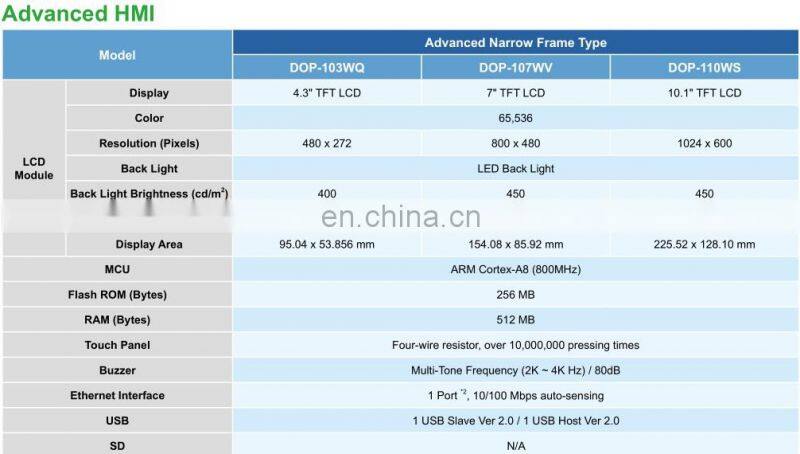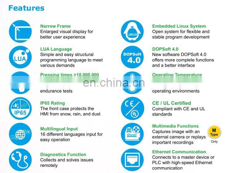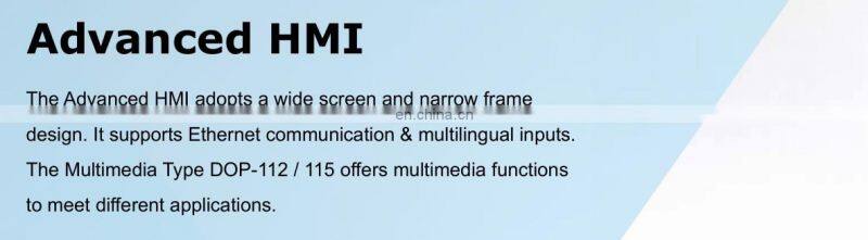 DOP-100 Series Human Machine Interfaces include a Basic HMI, Standard HMI and Advanced HMI for different applications. The HMIs adopt the latest Cortex-A8 / Dual Core high-speed processor and 65,536 color LCD screen with high brightness and contrast. In addition, they are equipped with the HMI programming software DOPSoft 4.0 and built-in