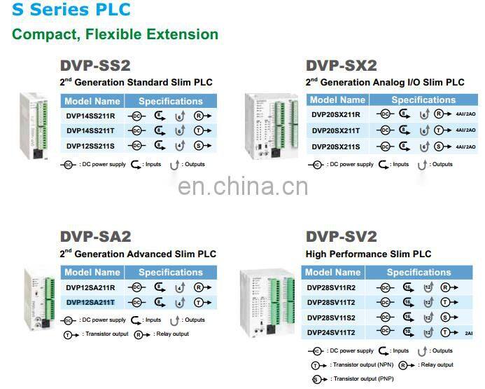 | 24VDC | Transistor (NPN) | 8 (4AI) | 6(2AO) | DVP20SX211T | |