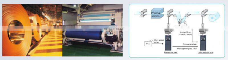 Material tension is kept constant by employing speed control and torque control to eliminate slack and uneven winding.By using a motor with the speed ratio most appropriate for the machine, the inverter capacity can be downsized.