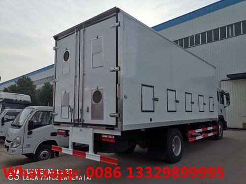 Dongfeng D9 day old chicks transported truck, adopts Dongfeng D9 one row and a half driver cab, 5200mm wheelbase, ISB180 50 Cummins 180hp diesel Euro Ⅴ engine, 3.9tons front axle/8tons rear axle, fastgear 8 speed gearbox, 9.00R20 rail tires, air cut braking, power steering, etc.