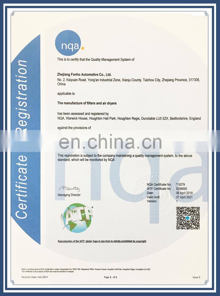 Zhejiang FONHO Automotive Co., Ltd. covers a total production area of around 17,000 square meters. FONHO is an IATF 16949:2016 certified manufacturer of air dryer cartridges, oil filters, fuel filters, air filters, solenoid valves, air brake system parts for trucks & buses since 2009.