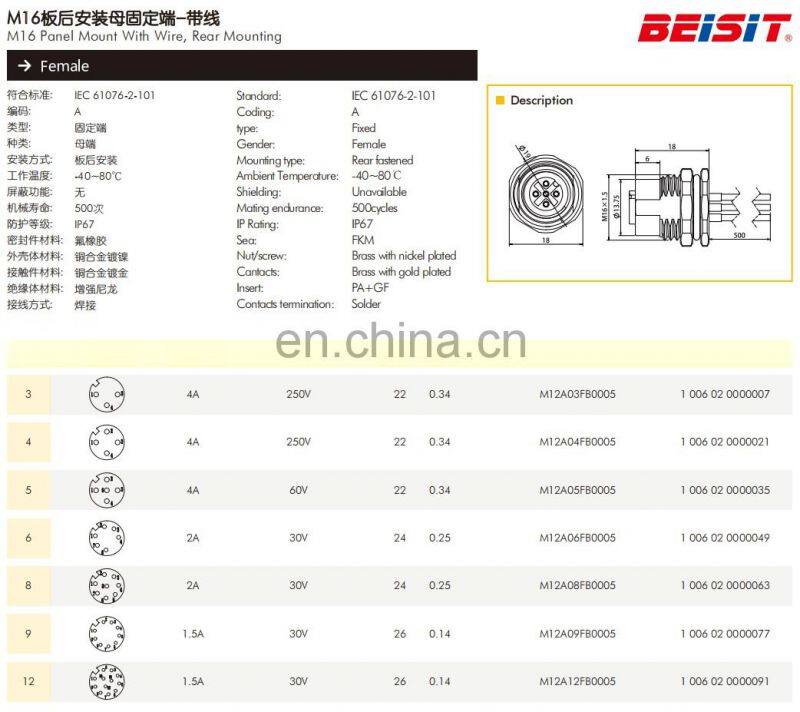 BEISIT M12 circular connector conforms to IEC 61076-2-101,IEC 61076-2-109,IEC 61076-2-111,IEC 61076-2-113 standard. It provides reliable and stable connection with light weight and small profile, quick and easy to use. BEISIT M12 increase your option in numerous industries and area of applications in electrical automation, railway, control systems and many others We offer various of connector orientation in mounting including front, rear and square-flange. The cable version come with field cabling, pre-assembled, pre-molded with designated cable length upon the customers specifications. At present we released A code, D-code, and T-code in standard configurations. All codings are thread coupled.