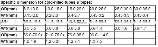 OD: 8.0mm-114.0mm (0.32"-4.49"), WT: 0.5mm-7.5mm (0.02"-0.30"), Length: 4000mm (157.5") max (OD.: 8.0mm-15.0mm, 0.32"-0.59"), 12000mm (472.4") max (OD. over 15mm, 0.59") Extruded: OD: 25mm-210mm (0.98"-8.27"), WT: 4mm-30mm (0.157"-1.18"), Length: 1000mm-10000mm (39.4"-393.7") |