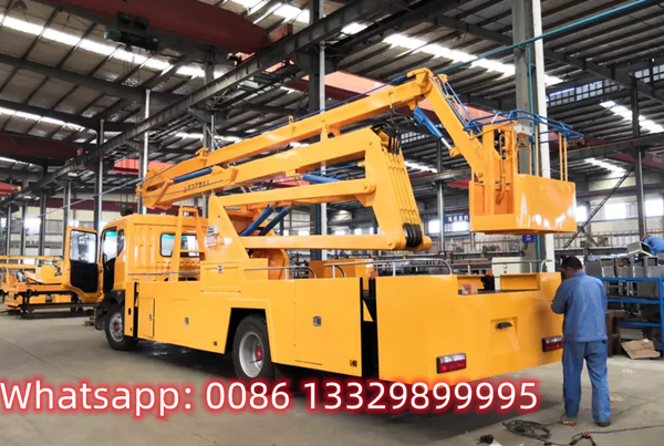 Dongfeng D9 4*2 LHD 20-meter high-altitude operating vehicle adopts a folding crank arm structure, the operating arm is three-section folding, the working bucket and the turntable have double working positions, up and down operation, electro-hydraulic control, 360-degree rotation, four hydraulic outriggers, inside the working bucket It can control the start and stop of the engine, the boom has a hoisting hook system, the hook lifting weight is ≤900kg, the manned working bucket is 200kg, the steel tool box and the pattern anti-skid platform, and the stainless steel fence.
