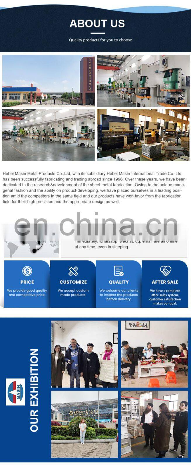 Our company is situated alongside the 104 national Road in Cangzhou, which has been praised as the "famous hardware citiy" in china. It covers an area of more than 10000 square meters and in which, nearly one hundred staff are professional talents in relevant domains. Our main products are: sheet metal fabrication, stamping metal parts, deep drawing parts and CNC machining parts which are widely used in automotive areas and construction areas.