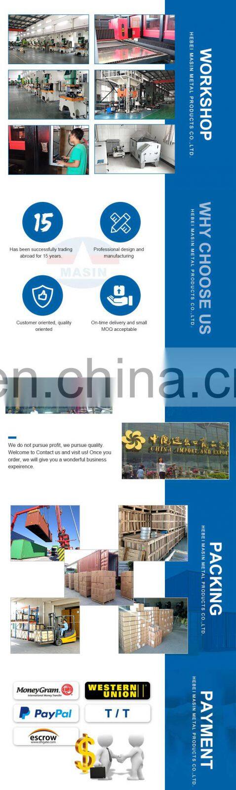 Hebei Masin Metal Products Co.,Ltd, which is parent company of Hebei Masin International Trade Co.,Ltd, has been successfully trading abroad for 21 years. Over these years, we have been dedicated to the research&development as well as the exporting of the metallic stampings. Owing to the unique managerial fashion and the ability on product-developing, we have placed ourselves in a leading position amid the competitors in the same field and our products have won favor from the metallic field for their high precision and the appropriate design as well.