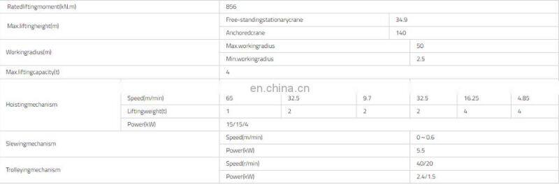 • Max. free-standing height: 34.9m; Max. working height of anchored crane: 140m;