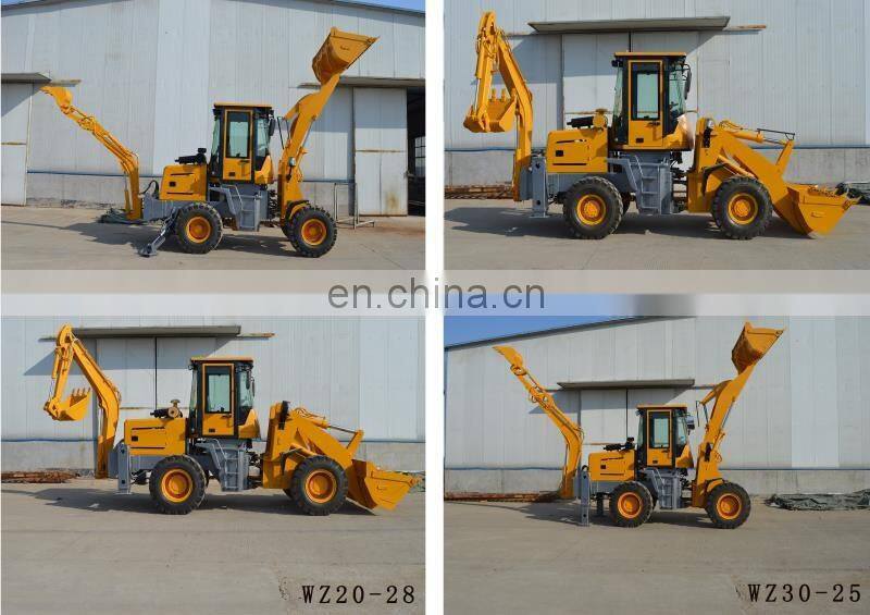 It also can be used in excavating, carrying and leveling and can carry on the flexible and swift homework to scarp heap and waste residue of the large and medium-sized enterprise. It is the ideal model of realizing machine with multi-functions. the wheel type excavators a loader is to fight pair, unhitch in the front, articulate, type style excavators a loader.WZ30-25 front end loader backhoe loader hot sale in Peru