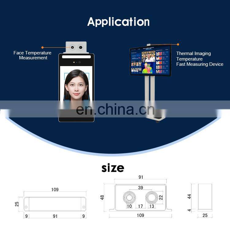 The temperature measuring thermal imaging module is developed based on wafer chip scale packaging uncooled vanadium oxide infrared body temperature detector, fit for working with various intelligent platform. It boasts the features of high performance, low power consumption, small size and easy for development and integration. It meets the secondary development requirement of various infrared temperature measuring applications. The thermal imager module can be connected to a face recognition device or an Android device for multi-person temperature measurement.