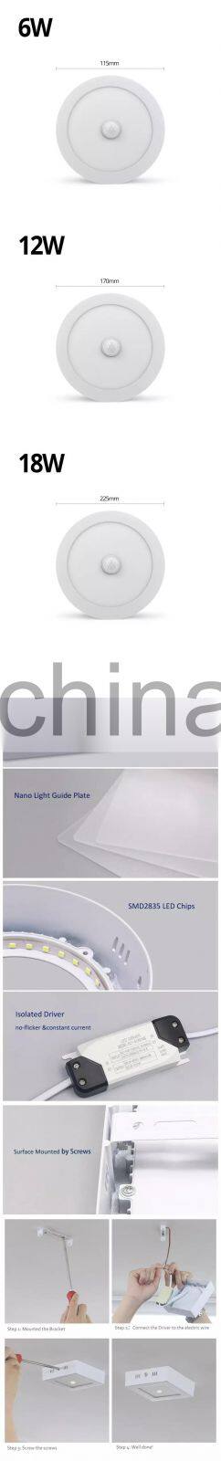 3W 6W 9W 12W Ceiling Light Surface Mounted Motion Sensor Dimmable LED Panel Light For Indoor Lighting