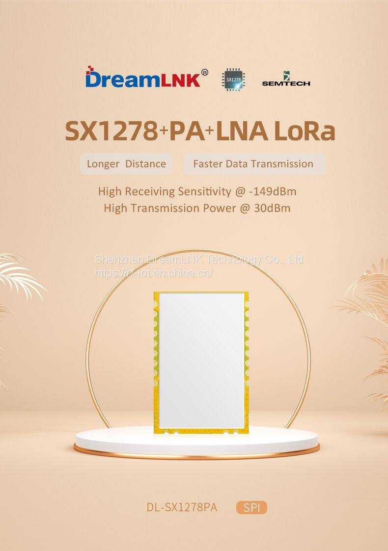 DL-SX1278PA is a high power 433Mhz LoRa Transceiver Module, which was developed by DREAMLNK based on Semtech's RF chip SX1278. For long-range transmission and better coverage concern, a power amplifier (PA) and a low noise amplifier (LNA) are integrated in this LoRa module, which improves its output power (up to 1W) by more than three times of the original SX1278 chip. Meanwhile, its receiving sensitivity has been greatly improved, with its sufficient link budget and advanced LoRa™ spread spectrum technology, this LoRa Module can achieve a longer transmitting distance.