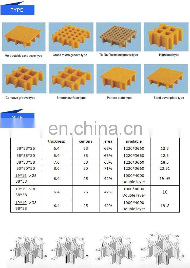 The perfect combination of the continuous E-glass roving and thermosetting polyester resin provide grating with light weight and high strength and its specific gravity is only 1/4 of that of steel, 1/3 of aluminum. Different thickness and mesh size bring the client more choice.