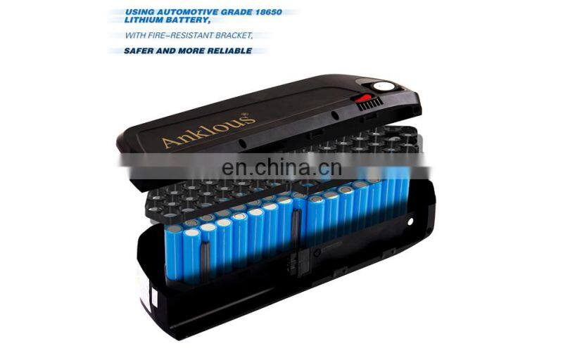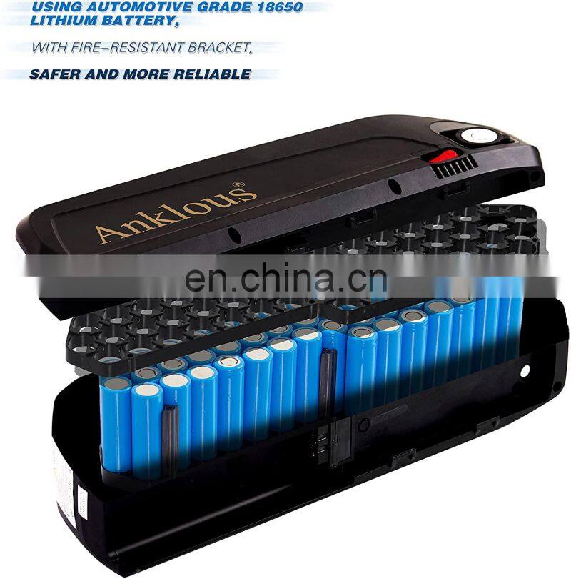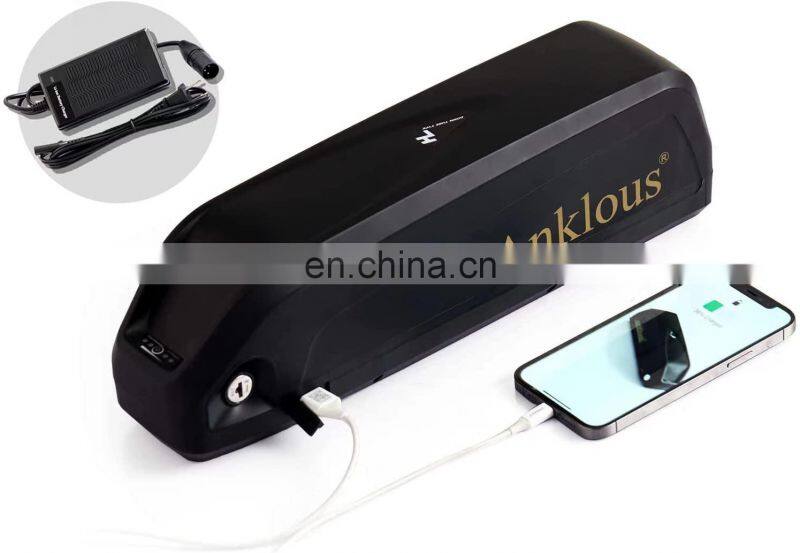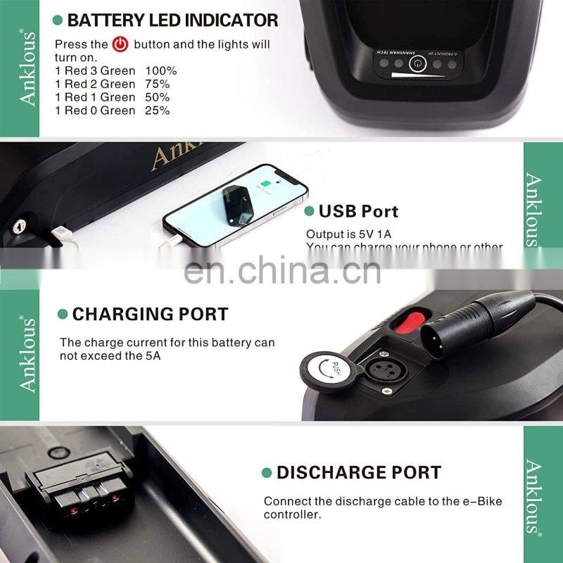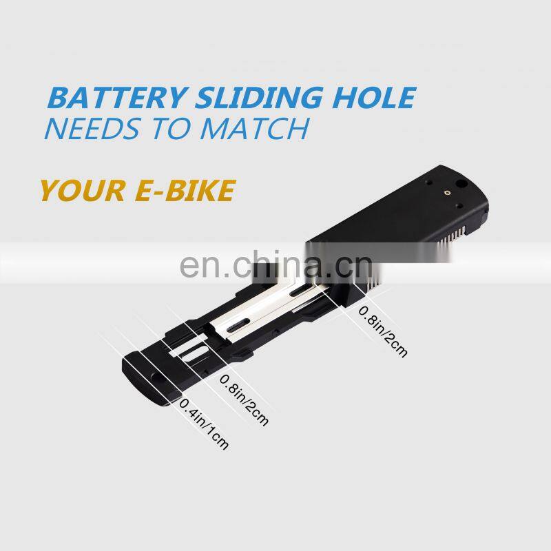 【Key Features】The electric bike battery with battery base that will fit for most bike frame. //Lock with keys securely locks the mount on bike frame, prevents the battery from being stolen.// With USB port can charge cell phone.//With on/off button, save more power.// Lighted battery LED power Indicator, inform you charge your battery on time.// Each pack have ran through a full charge and discharge test in produce, make sure you getting every amp hour you paid for.