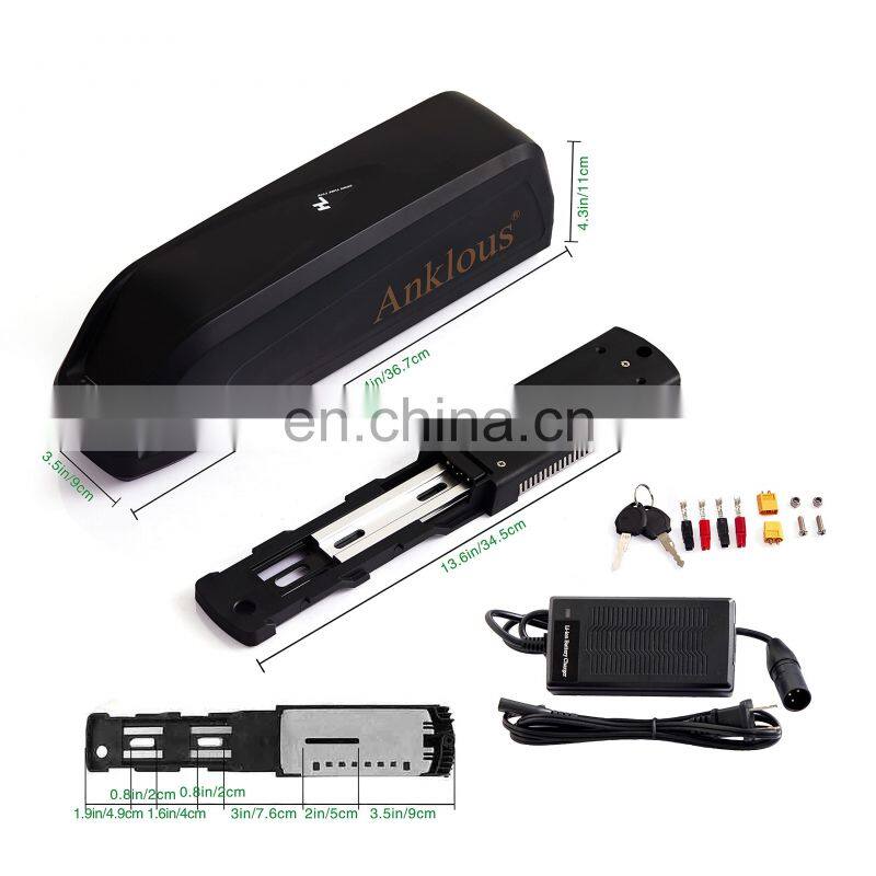 【Parameter】This Ebike battery is 48V 15AH, suitable for 1000W/750W/500W motor(50W-1000W) motor. Max constant discharge current:30A. Size: 365*90*127MM. Charger: 54.6V 2A . Discharge:Anderson(Male&Female Side)