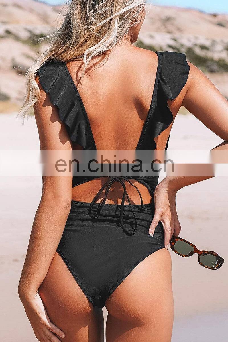 Wholesale Supplier Girls Shiny Swimwear High Fork Backless One Pieces Thong Swimsuit in Black