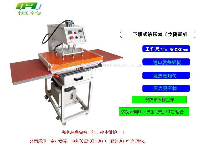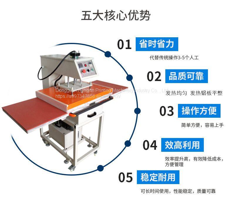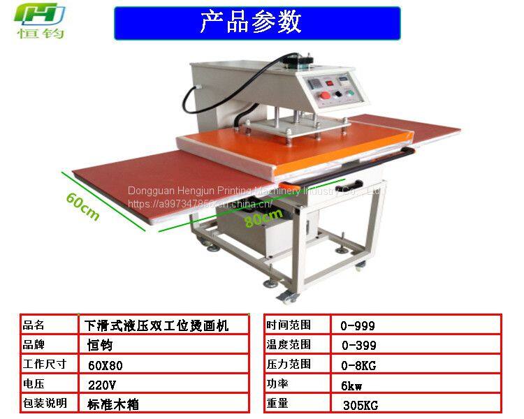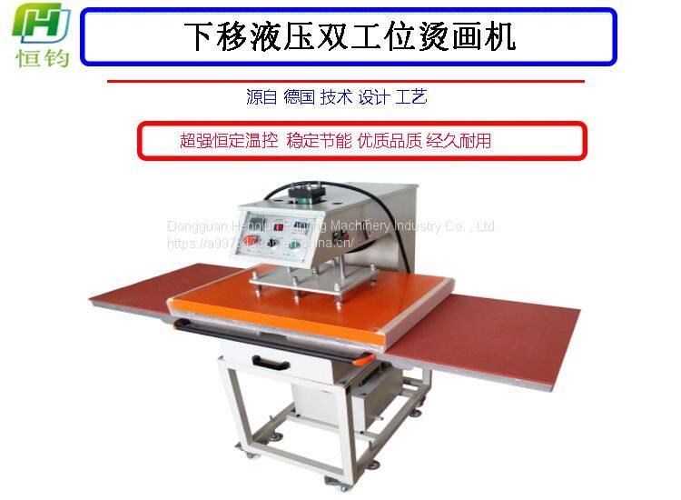 Hydraulic double location pyrograph machine can be sublimated, solvent ink color logo and the heat transfer in such as cotton, hemp, chemical fiber, nylon fabric and ceramic products, also can be flocking pyrograph and foaming printing process such as heat treatment, and the low temperature low pressure line of the clothing and fabric of the adhesive, such as clothing, shoes and hats and other glue, also can be used in the production of small batch handkerchief