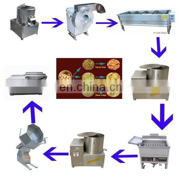washing and peeling--cutting--blanching--dewatering--frying--de oiling--seasoning--packing