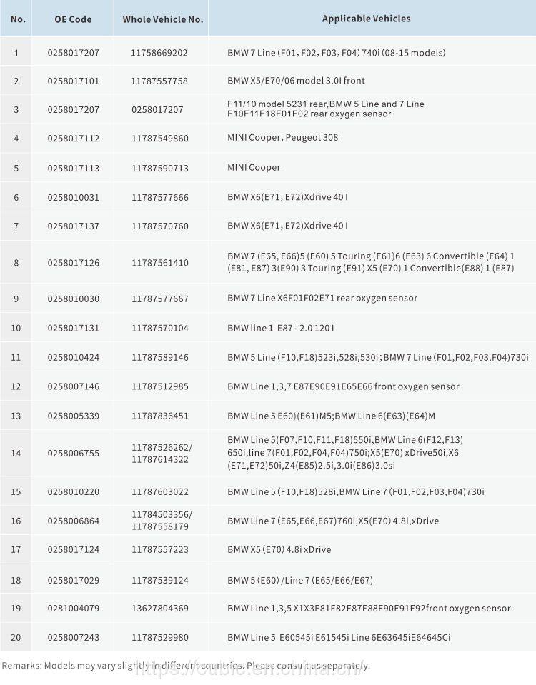 | 12 | 258007146 | 11787512985 | BMW 1 3 7 Series E87 E90 E91 E65 E66 Front Oxygen Sensor |