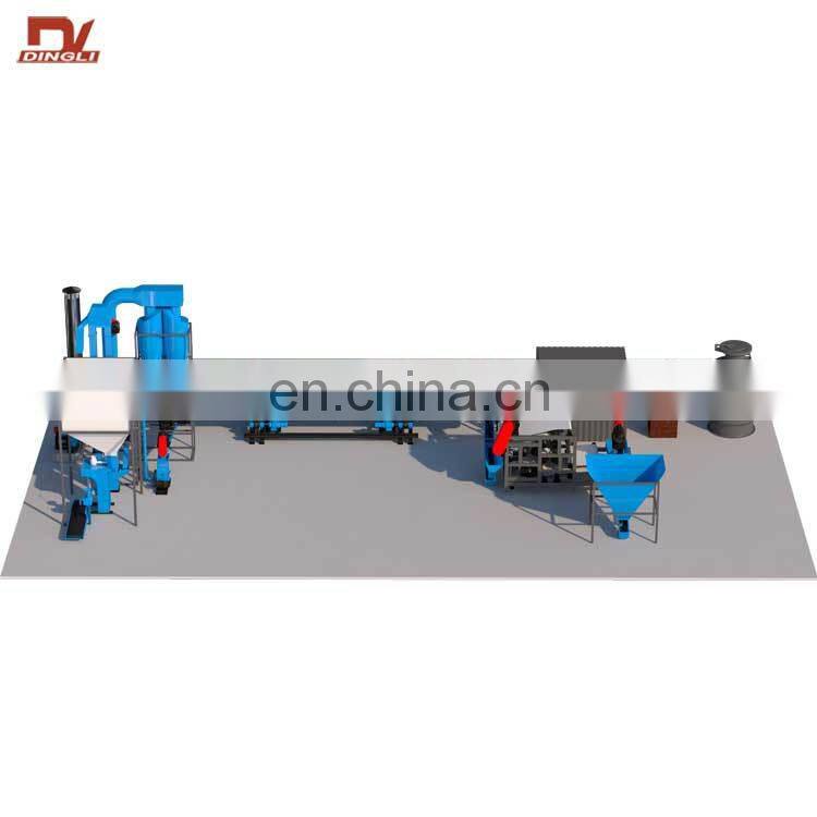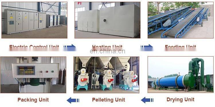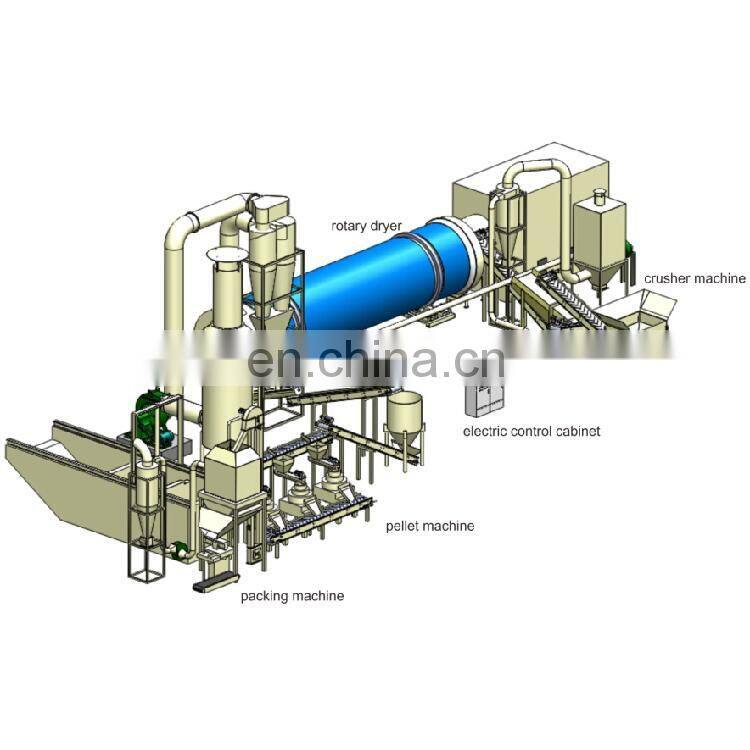 Complete Biomss Pellet Production Line consists of  heater, feeding machine, rotary drum, discharging machine, induced draft fan, unloading feeder, cyclone, odor removal equipment and power distribution cabinet.
