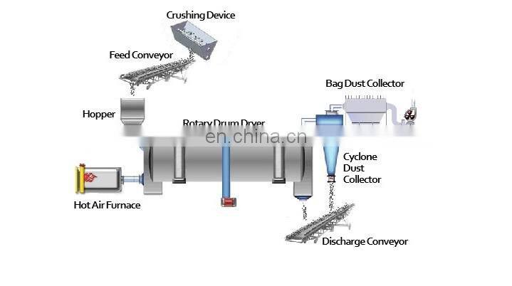 The flowchart of gas: the air is heated by the hot air furnace of draught fan and enter the hot air furnace to burn and get heated, the temperature reaches 600-850°C. After the dryer, the induced draft fan draws the material in the dryer to dry, evaporate water, pass the three-layer heat exchange, and the wind temperature reduced to 55-60°C and discharged from the dryer. The dust containing wet dust passes the cyclone dust collector and the wet dust collector gets to the emission standards.