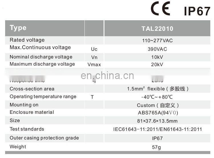 LED Street Lights Power SPD: TAL22010 designed for protecting LED Driver and could be connected perfectly with its input port, sealed enclosure, waterproof and dust-proof, IP67 protection grade,belongs to Class III power SPD. This SPD use common mode, differential mode, full protection with leakage current and cut the over-current capabilities.