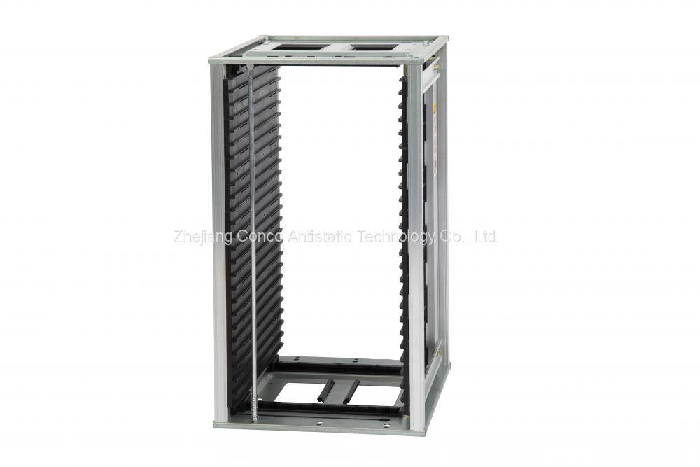Smt esd pcb magazine rack is made of aluminum alloy column, side panel, The adjustable coupling drive set, static material four parts