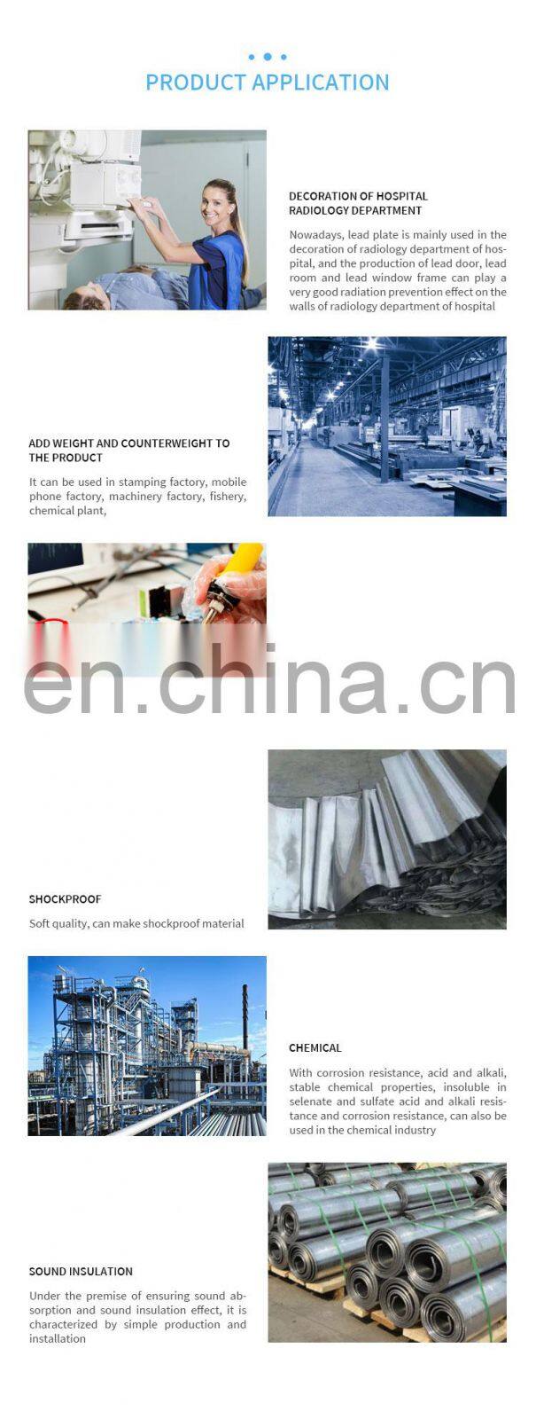 Lead plate has strong corrosion resistance, acid and alkali resistance environment construction, medical radiation X-ray. CT room ray protection, weight, sound insulation and other advantages.