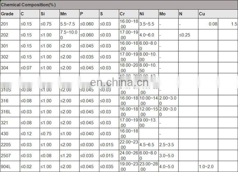 Steel Grade | 301L, 301, 316L, 316, 304, 304L |