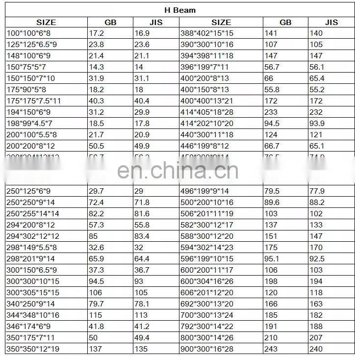 Widely use in construction and other posting application. Size from 100*100mm to 900*300mm , weight per meter from 17.2Kg to 286Kg. The standard length is 6 meters and 12 meters. The most popular grades are Q235B (Equivalent with St37.2, S235JR,ASTM A36) and Q345B (Equivalent with St52.3, S355JR).
