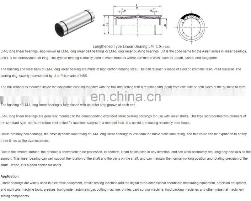 Linear bearings can be used for: Electronic equipment ,Food machinery ,Packaging machinery ,Medical machinery ,Printing machinery,Textile machinery ,The robot Machine tools,Nc machine tool ,Automotive and digital 3d coordinate measuring equipment