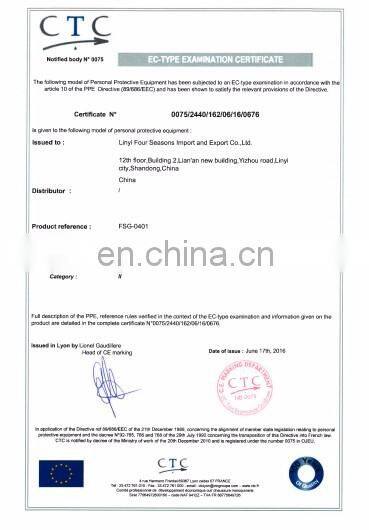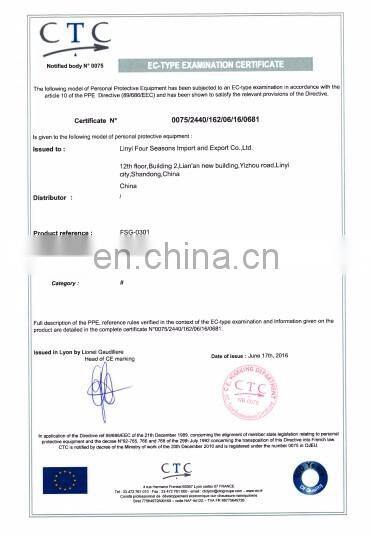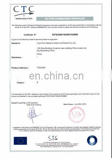 LINYI FOUR SEASONS IMPORT AND EXPORT CO.,LTD.located in Linyi city, Shandong province. Our major product is all kinds of labor protection products, like different kinds of safety gloves, safety helmet, safety glasses, safety shoes and safety clothes.