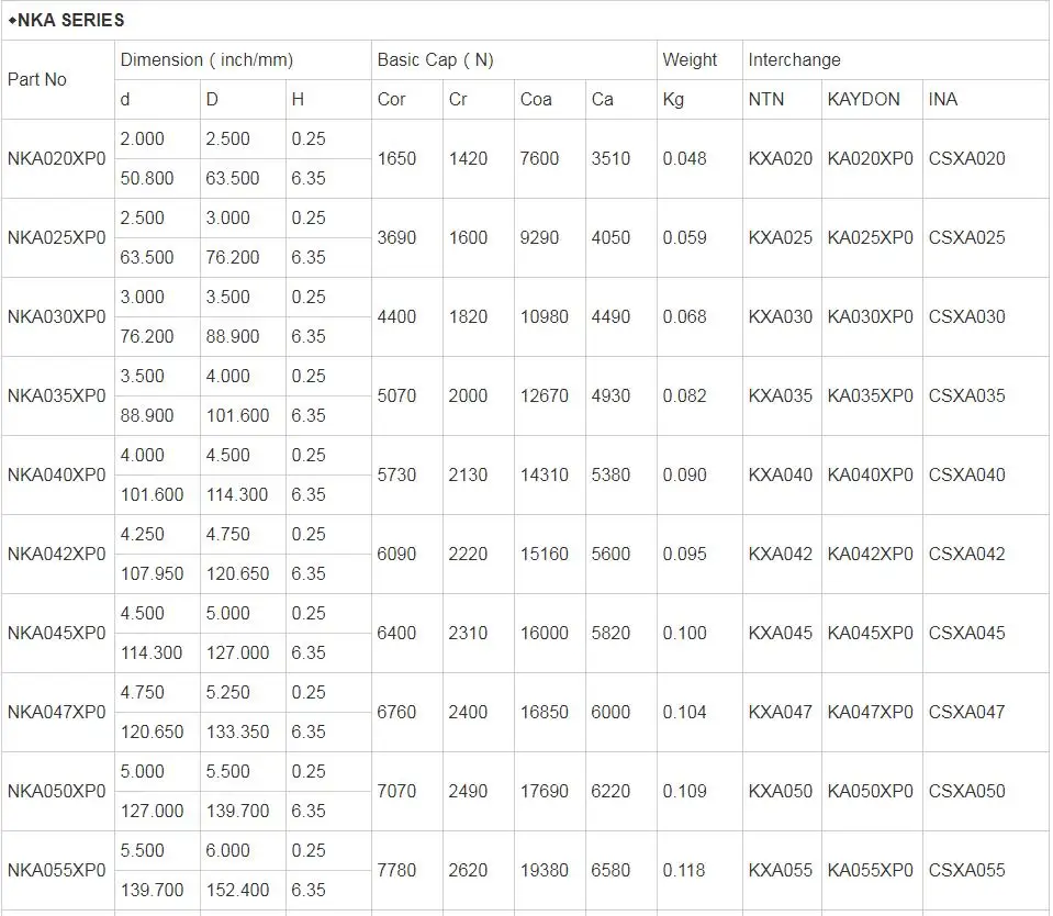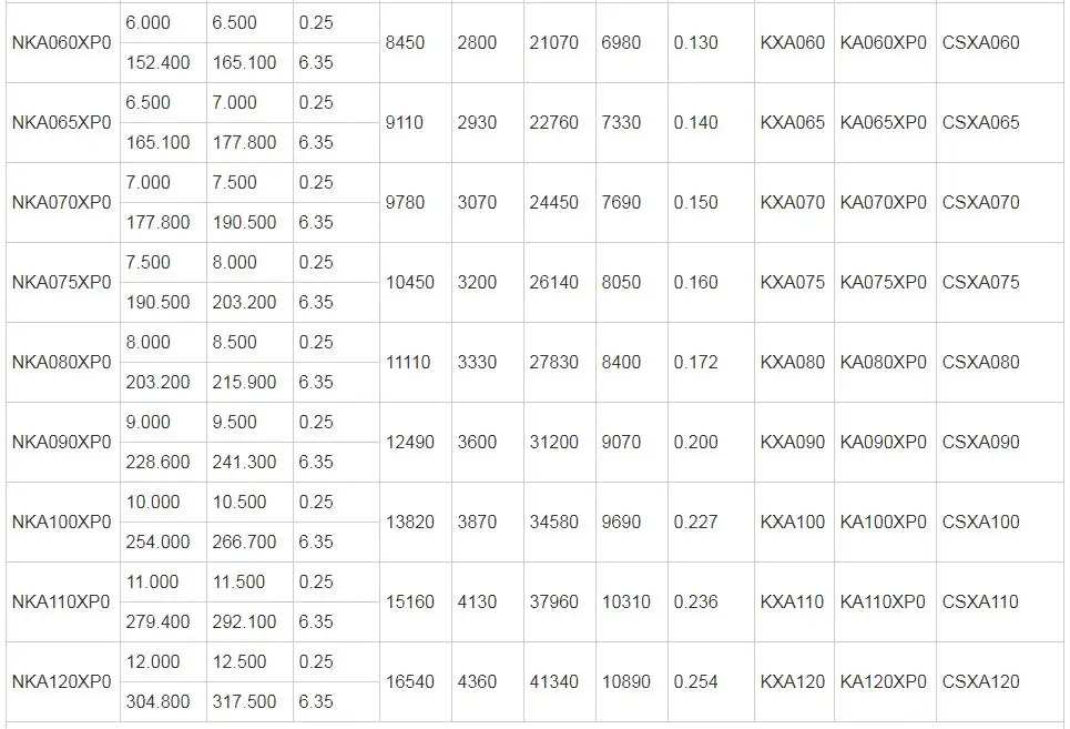 KA065 XP0 KA Series Type-X Thin Section Ball Bearing 165.1 x 177.8 x 6.35 mm KA065XP0 Ultra Thin Section Four Point Contact Bearings 6.5 x 7 x 0.25 inch, Thin Walled Bearing KA065XP0 With Cross Section 1/4 x 1/4 inch, id:6.5 inch, OD:7 inch, KA065XP0 Thin section four point contact ball bearing belongs to KA SERIES of thin section ball bearings, the KA SERIES include KACP0, KAXP0 and KAAR0,which represented : Type-C : Deep Groove bearing, Type-X: Four Point Contact bearing and Type-A: Angular Contact bearing, the rolling body of these bearings is ball, which can be nylon ball or steel ball as requested. The bore size of KA SERIES are ranged from 2 inches to 12 inches and the outer diameters are arranged from 2.5 inches to 12.5 inches, while the Cross Section is constant, that is 0.25 inch.