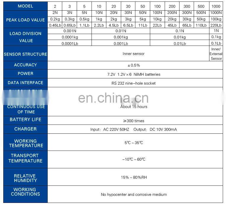 | 1.High precision and high resolution. 2.Five testing modes and three display methods for selection 3.N (Newton), kg (Kilogram) and lb (Pound) three measuring units for selection and conversion. 4.Setting function of gravity acceleration 5.Function of peak value maintaining. 6.Automatic peak function. 7.Max and min and comparison value can be set for statistic analysis. 8.Data storage function. 896 testing values can be stored. 9.Data output function. The data can be input into computer through data line for various analyses. 10.Environmental protection. 11.High quality chargeable power supply. |