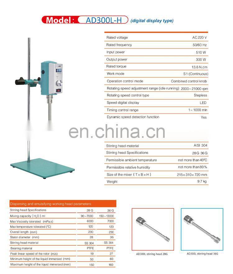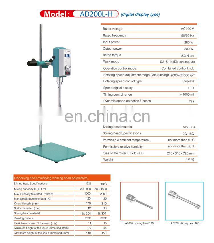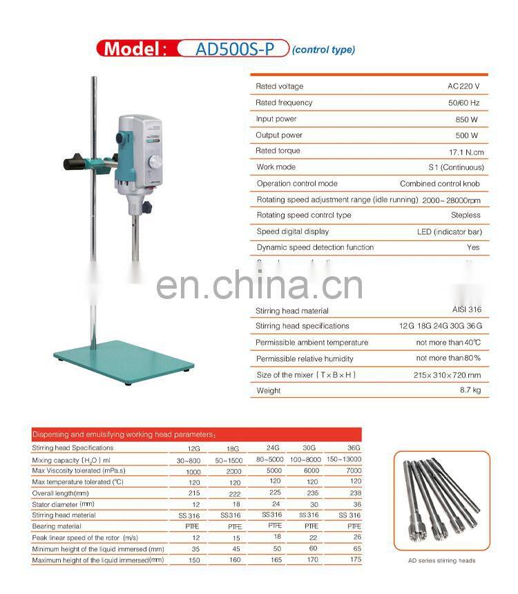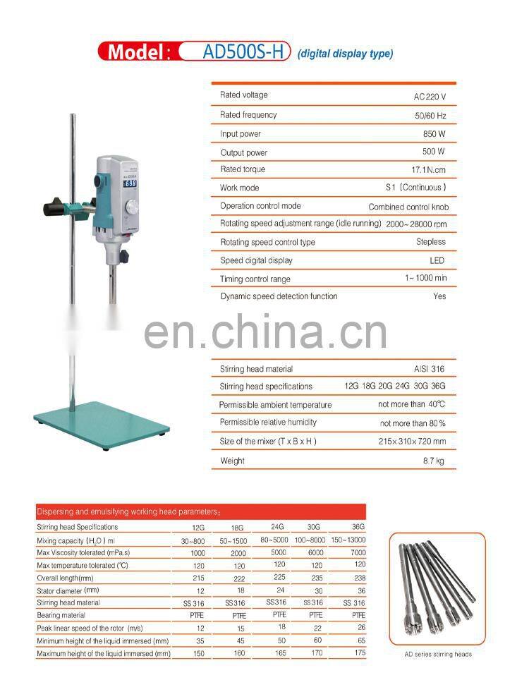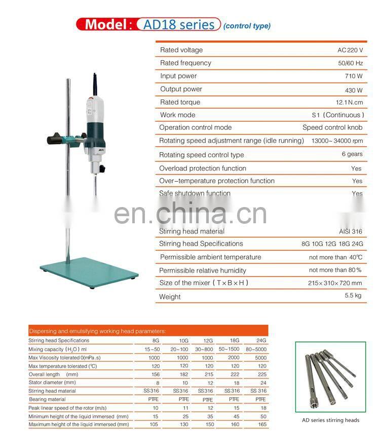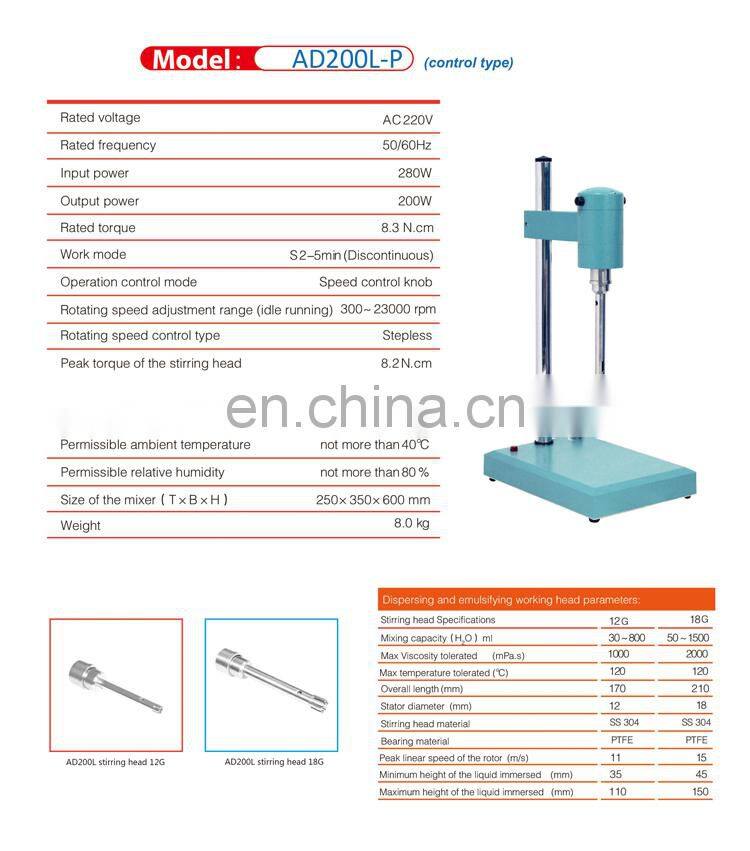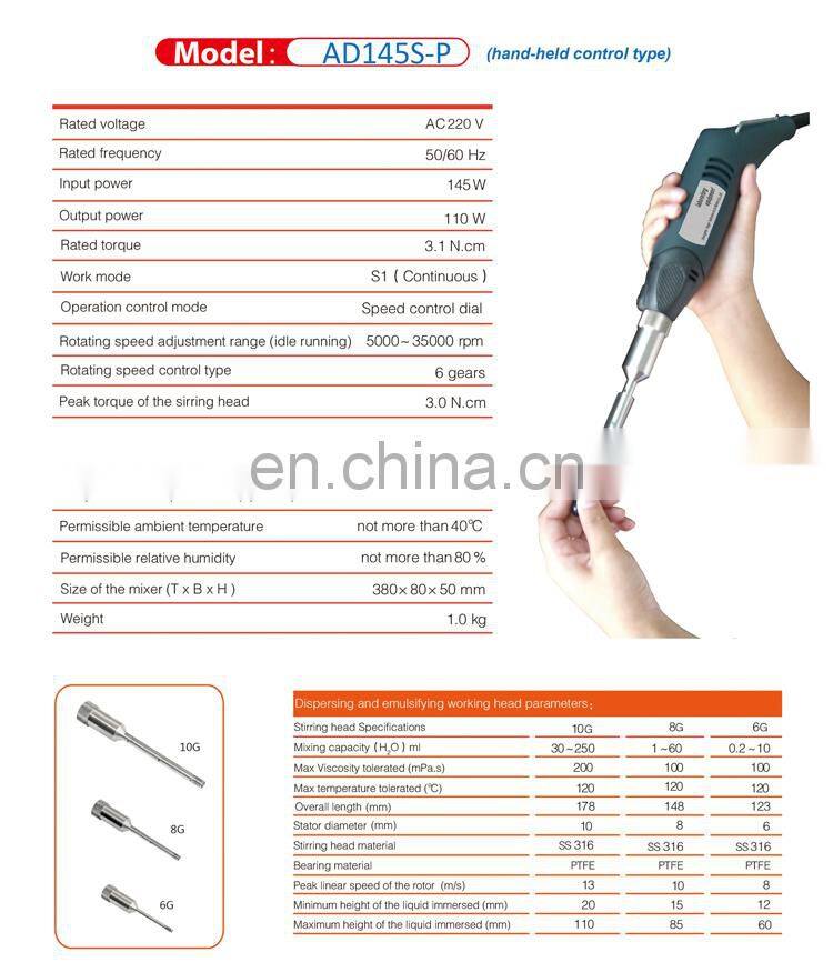 The small homogenizer can be applied to different areas like dispersing of tissue, sample preparation, cosmetic industry, paint industry, petro-chemical processing etc. It can be applied to any liquid material experiment which viscosity less than 5000 mPa.s, temperature below 120 ℃.